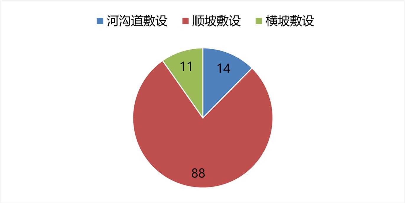 本次调研针对东南多雨区的广东省境内管道,该区域多年平均降雨量达1771 mm,历年雨季最大降雨量及极端降雨呈逐年递增趋势[8],能较好地反映水工保与水土保持设施的实际性能,具有代表意义。调研采用现场实地点对点踏勘的方式,在现场逐一对水工保护与水土保持措施的工程效果进行分析。本次调研共计113个水工保护与水土保持设施点位。根据管道敷设方式,调研部位有顺坡敷设、横坡敷设及河沟道敷设段,其中顺坡敷设88个点位,横坡敷设11个点位,河沟道敷设14个点位(图1)。水工保护与水土保持设施材料分析,本次调研的材料为浆砌石、混凝土和生态袋;从水工保护与水土保持设施结构分析,本次调研的主要结构有截水墙、挡土墙、坡面截排水渠、坡面堡坎和坡面导水坎等。生态袋因其施工方案、施工效率高、可降解环境友好、柔性结构适因大变形的特点,已大量应用于油气管道工程[9]-[12],本次调研将重点关注生态袋材料截水沟在油气管道水工保护与水土保持设施运行中的表现。