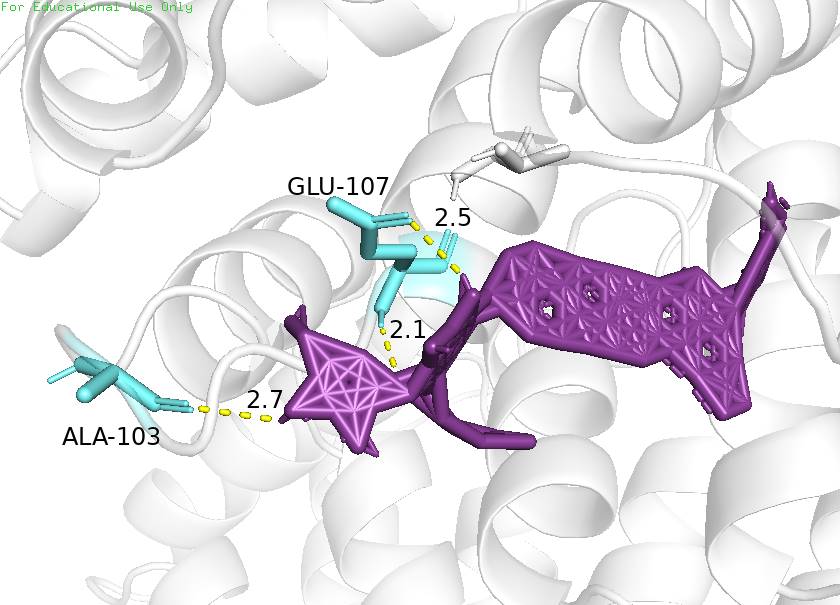 注:图中紫色表示核心成分的小分子,绿色标识表示氨基酸残基及名称代码、黄色虚线表示氢键及距离。