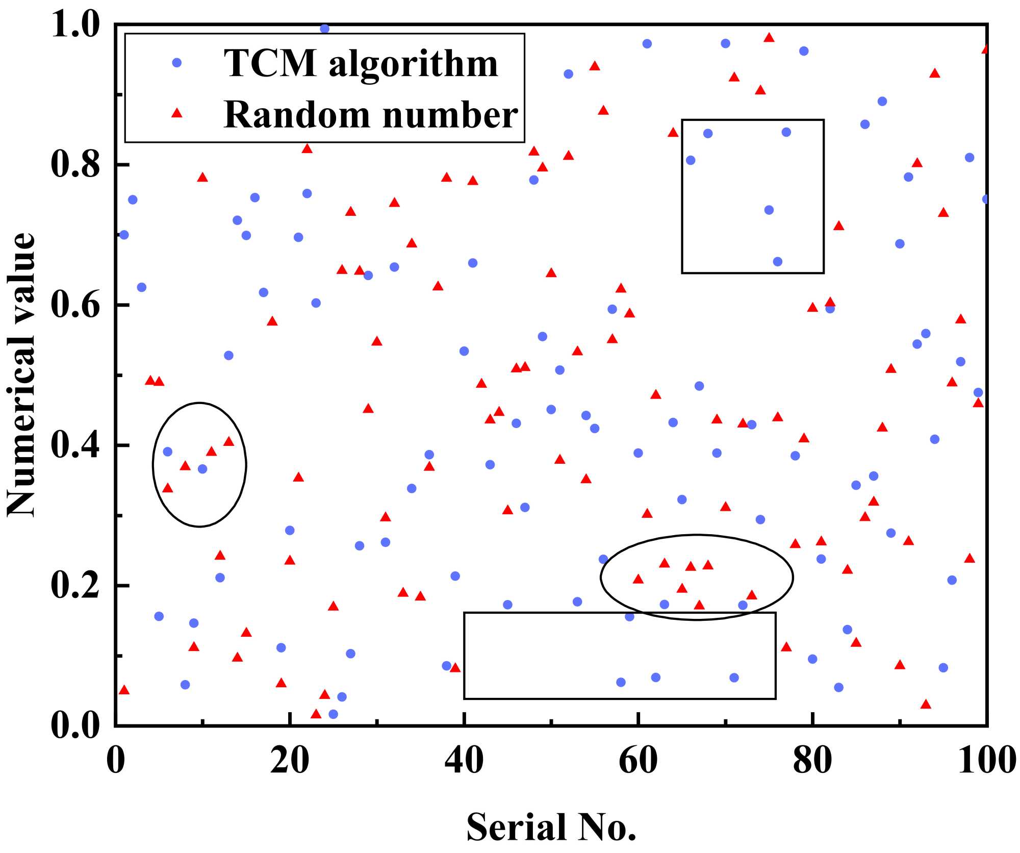 图1给出TCM算法与随机数之间的比较,其中蓝色圆圈和红色三角分别表示采用混沌模型和随机数进行初始化的结果。从图中可以看出:随机数取值集中在椭圆框内,而在矩形框内几乎没有取值,这表明随机数可能会导致种群的单一性和局限性。为了维持种群的多样性和覆盖性,避免算法陷入局部最优解,可以使用TCM模型对鲸鱼初始种群进行生成。TCM模型能够在解空间中实现种群的均匀分布,从而增强算法的全局搜索能力,提高搜索效率。