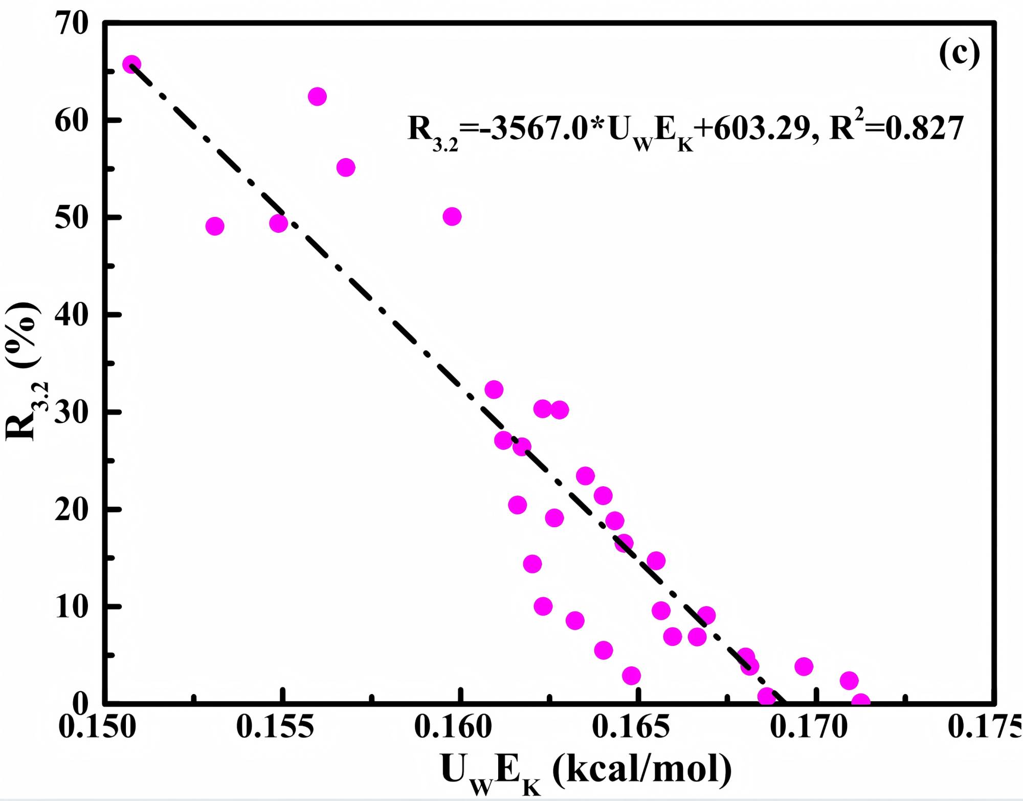 Ren等[13]将分子动力学模拟与能量分析联用,研究不同再生剂对老化沥青的恢复效果。研究表明,再生剂通过提升老化沥青的CED指标而对沥青高温性能进行修复。此外,他们还研究了在原子规模层面的能量参数与宏观流变性能的定量关系,发现零剪切粘度ZSV指标与CED的相关性较为明显,动能指标(UWEK)与再生沥青的高温流变性能指标也具有强相关性(图12、图13),提示我们可以利用这种相关性对更多种类的再生剂对旧沥青高温流变性能的影响做预测。该课题组还利用MD模拟方法对不同条件下再生剂的再生效率差异原因进行了研究,认为再生剂的分子迁移率、分子体系中的自由体积均是导致不同再生效率差异的主要原因[14]。此外,该课题组还发现再生剂类型、沥青老化程度以及温度这三个因素也会对再生剂–老化沥青界面扩散能力造成影响[15]。