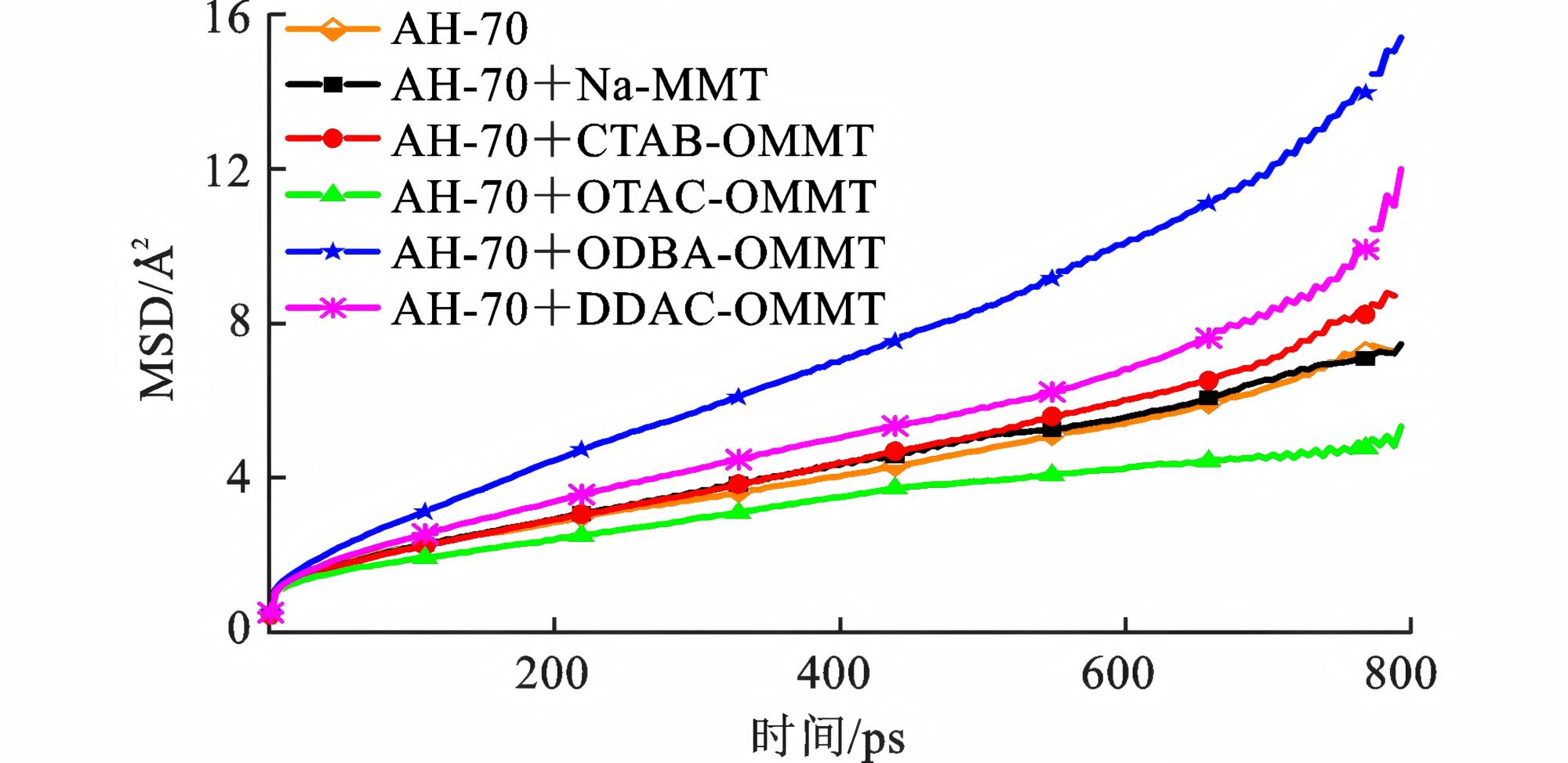 Wang等[16]通过MD方法计算了插层层状氧化物LDH在使用紫外吸收剂BP改性前后与改性沥青分子之间的溶解度参数、相互作用能,阐明了BP-LDH改性后拥有与改性沥青更好相容性的分子机理。