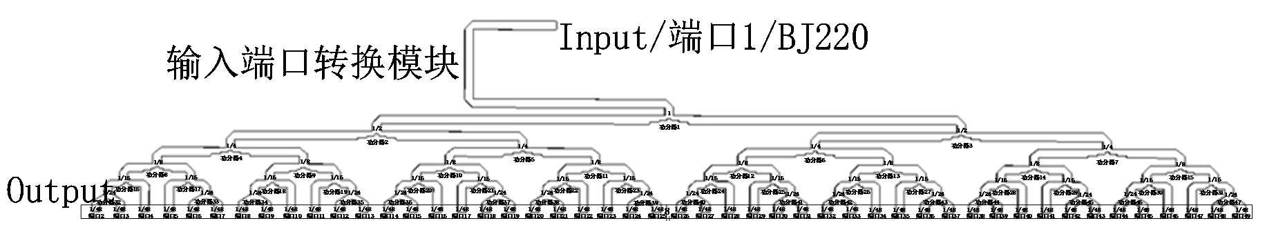 将多个E-T结级联组成波导功分器,E-T结的阻抗带宽随台阶级数增加而拓展,两侧引入拐角结构,解决输出反相问题。幅度及相位可以由台阶、拐角与传输线长度任意控制,为产生TEM波,控制幅相一致。根据上文可知,低/高频输出端口数目分别为32、48个。无耗网络各输出端口传输系数为