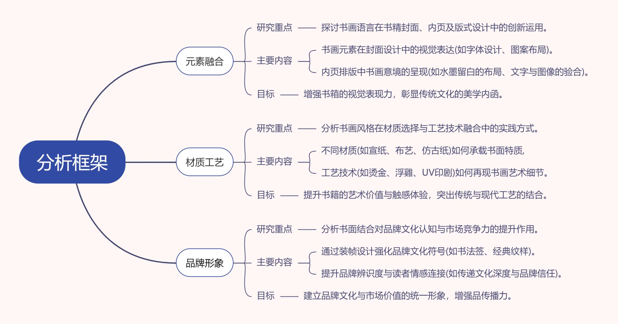 基于这一理论,本研究构建了更加系统和具有解释力的分析框架,围绕“元素融合”、“材质工艺”和“品牌形象”三个维度展开,如图1所示。元素融合维度探讨了书画语言在封面、内页和版式设计中的创新应用;材质工艺维度关注书画风格在材质选择和工艺技术上的融合实践;品牌形象维度分析了书画结合对品牌文化认知与市场竞争力的提升作用。该框架通过对书画结合的深入剖析,不仅为书籍装帧设计提供了文化价值与美学特征的系统呈现,同时也揭示了如何在传承传统文化的同时,平衡现代市场需求的挑战。