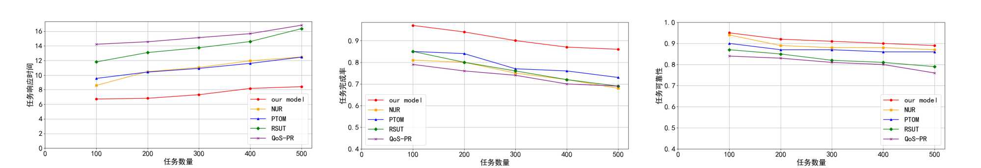 上述不同模型在Yelp数据集和Gowalla数据集的中的对比实验结果如图3和图4所示。随着任务数量的增加,三种指标的变化趋势分别为任务响应时间逐渐上升、任务完成率逐渐下降、任务可靠性逐渐下降,可知随着任务数量增加,模型性能会减弱。在每个任务数量下,本研究模型在三种指标上的表现始终优于其他模型,尤其是在在任务完成率上展现出较大的优势。此外,随着任务数量的增加,本研究模型的三种指标结果始终保持较高水平,就算在高负载任务场景下依然能够维持较好的执行效果。相比之下,其他对比算法在任务数量增大时,三种指标都呈现较大幅度的改变。实验表明,本研究模型在能招募高任务完成质量工人的同时,具有更强的稳定性和适应性。