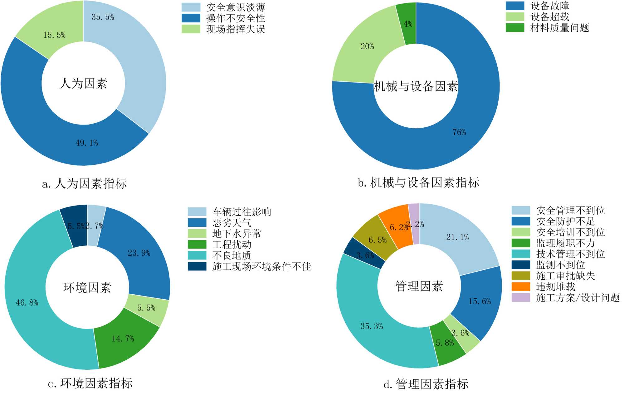 人为因素主要包括安全意识淡薄、操作不安全性、现场指挥失误及个人问题;机械因素涵盖设备故障、设备超载及材料质量问题等致因;环境因素则涉及车辆过往影响、天气原因、地下水、工程扰动、土质问题、有害气体、施工现场环境条件不佳等外部环境变化的影响;管理因素集中在施工审批缺失、技术管理不当、安全培训不到位、违规堆载、安全管理不到位、安全防护不足、监理履职不力、施工方案/设计问题及监测不到位等领域[10]。