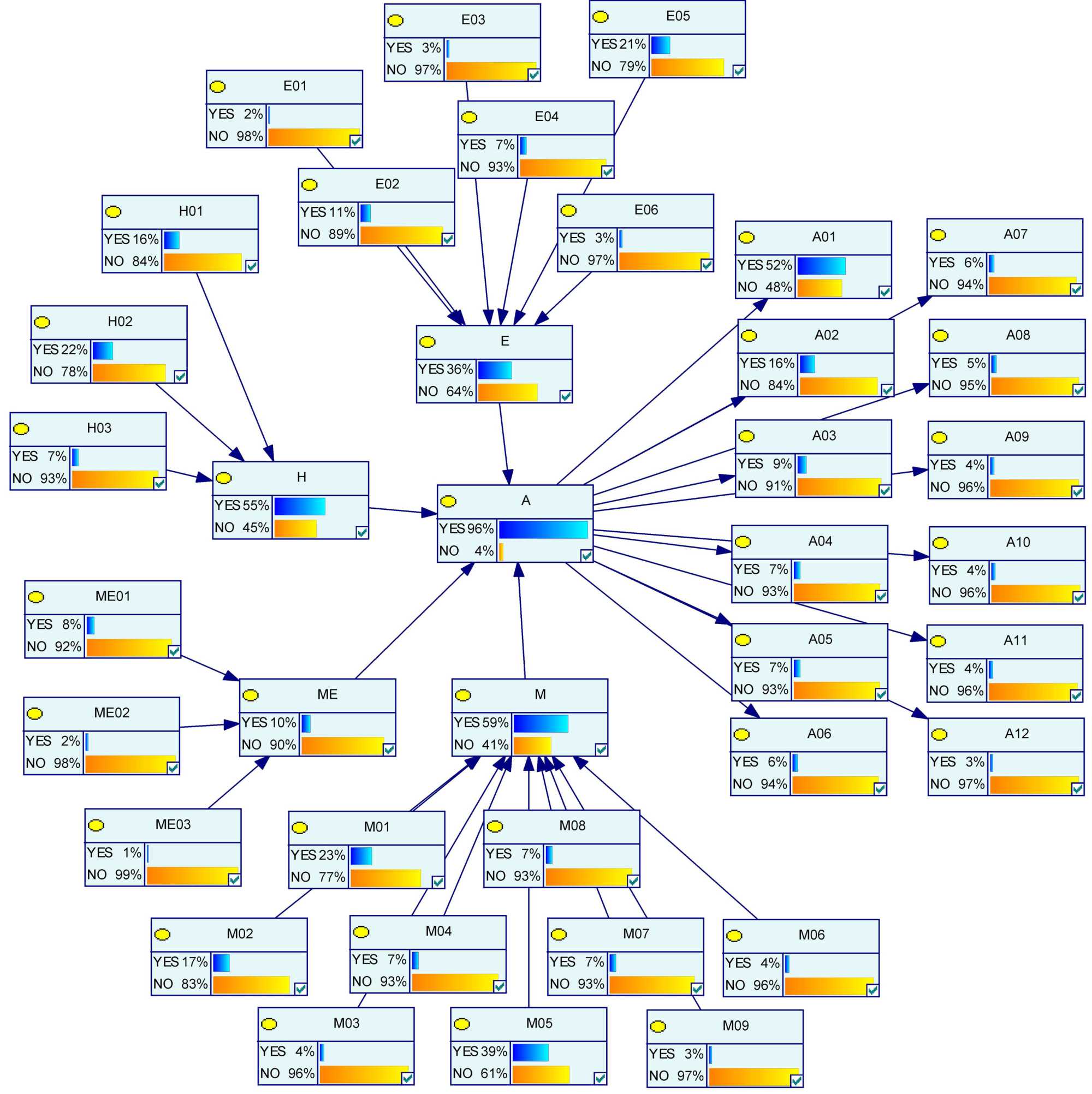 在进行敏感性分析时,通过将中心事件节点A(事故发生)设置为目标事件(Target),并对设备因素中的ME03(设备故障)设置为“YES”的情景假设,发现设备因素对中心事件的“YES”概率影响最大,可引起中心事件的风险概率增加至17%。环境因素中的E02 (恶劣天气)和E05 (不良地质)对事故风险的敏感性同样显著,这是由于恶劣天气不仅直接影响施工安全,还可能通过引发设备故障或操作失误,放大其他模块的风险。此外,人为因素中的H02 (操作不安全性)和管理因素中的M05 (技术管理不到位)对事故风险也有重要贡献,其中“操作不安全性”通过直接行为风险提高事故发生概率,而“技术管理不到位”则通过间接影响设备维护和环境应对能力,增加事故的发生概率。这一分析表明,机械因素与环境因素对事故风险的总体影响较大,尤其是设备故障和恶劣天气在本模型中具有较高的敏感性和关键性。这些关键节点的影响通过模块内外的耦合关系,最终导致事故发生的整体风险显著升高。