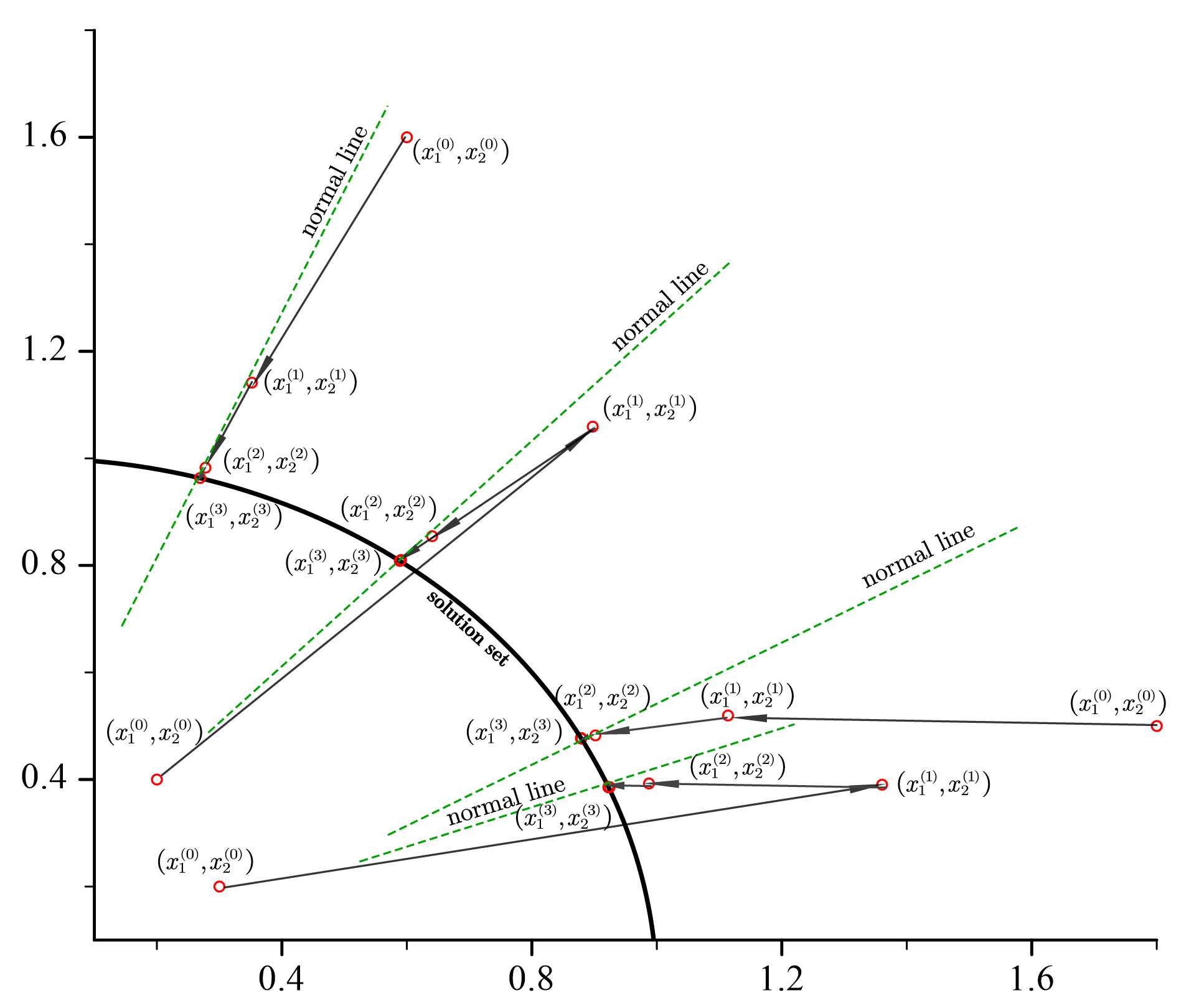 近年来,许多学者尝试使用牛顿法计算流形解。Griewank和Walther [9]提出自动微分技术,通过精确计算雅可比矩阵和高阶导数,提高了牛顿法在流形解附近的收敛性,但是计算量较大。Deuflhard [10]引入拟牛顿法,通过近似雅可比矩阵的逆矩阵,避免了直接处理奇异点带来的数值不稳定性,但存在收敛缓慢甚至不收敛的问题。Kelley [11]提出基于Krylov子空间的方法,通过迭代求解线性化系统的近似解,提高了大规模非线性系统中流形解的求解效率,但对初始向量的选择较为敏感。我们提出的算法解决了牛顿法在求解非线性系统流形解上的收敛性问题。