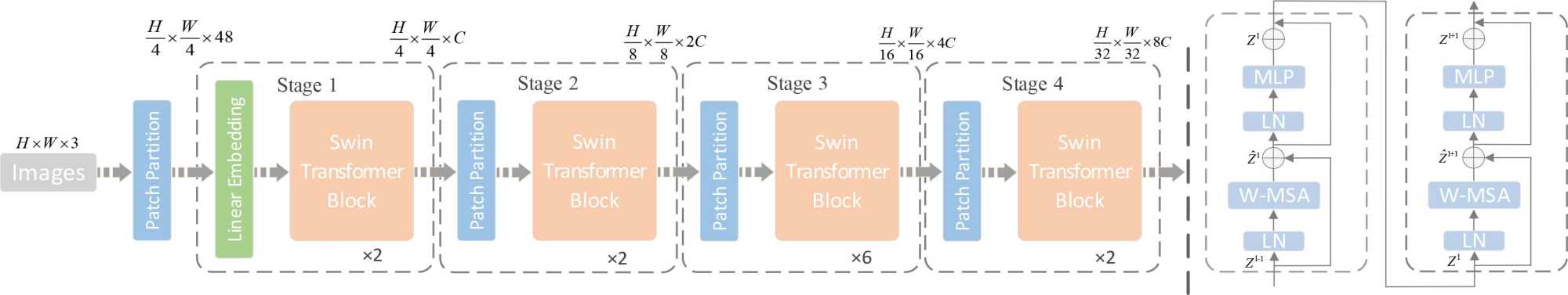 Swin Transformer [12]是一种自注意力机制的创新变体,网络结构如图3所示。旨在解决传统Vision Transformer (ViT) [13]在处理高分辨率图像时面临的计算复杂度问题。与传统ViT不同,Swin Transformer通过引入窗口自注意力机制,限制了每个自注意力计算的范围,从而大大减少了计算和内存的消耗。