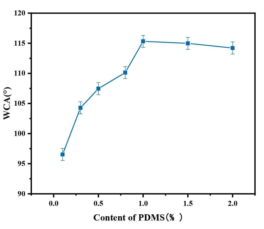 本实验采用接触角测量仪(SDC-100,苏州)对样品表面的水接触角(WCA)进行测量。对于每个疏水涂层,在不同区域分别进行三次测量,每次测量使用的水滴量为5 μL。图2展示了PDMS质量分数与涂层水接触角(WCA)之间的关系。实验结果表明,随着PDMS质量分数的增加,WCA呈现上升趋势。当PDMS质量分数达到1%时,涂层表现出最佳的疏水性能,WCA达到115.56˚。然而,进一步增加PDMS质量分数时,WCA略有下降。因此,可以得出结论:当PDMS质量分数为1%时,涂层的疏水性能达到最佳。