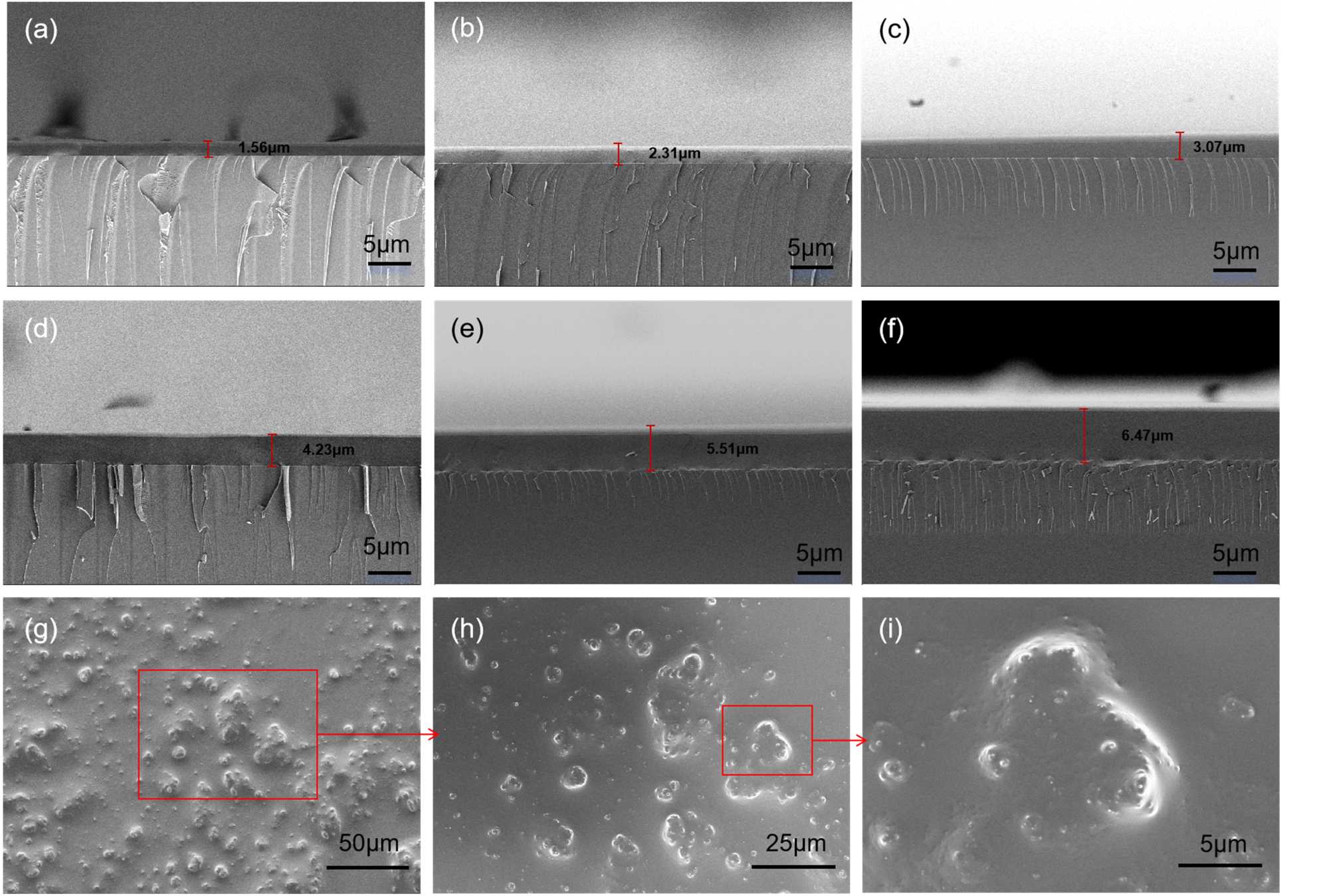 图4. 不同厚度涂层的截面(a) 1 μm,(b) 2 μm,(c) 3 μm,(d) 4 μm,(e) 5 μm,(f) 6 μm不同尺度下涂层的表面形貌(g) 50 μm,(h) 25 μm,(i) 5 μm