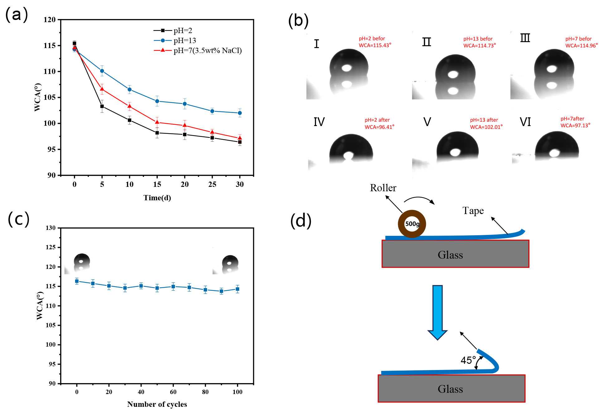 图5. (a) 涂层在不同溶液中浸泡30天后的水接触角(WCA)随浸泡时间变化的关系:pH = 2的HCl溶液、pH = 13的NaOH溶液及pH = 7的NaCI (3.5 wt%)溶液。(b) 涂层浸泡后的WCA光学图像:(Ⅰ) pH = 2溶液浸泡前;(Ⅱ) pH = 13溶液浸泡前;(Ⅲ) pH = 7溶液浸泡前;(Ⅳ) pH = 2溶液浸泡后;(Ⅴ) pH = 13溶液浸泡后;(Ⅵ) pH = 7溶液浸泡后。(c) 胶带剥离循环次数与水接触角(WCA)变化的关系及剥离前后涂层的WCA光学图像。(d) 胶带剥离实验示意图