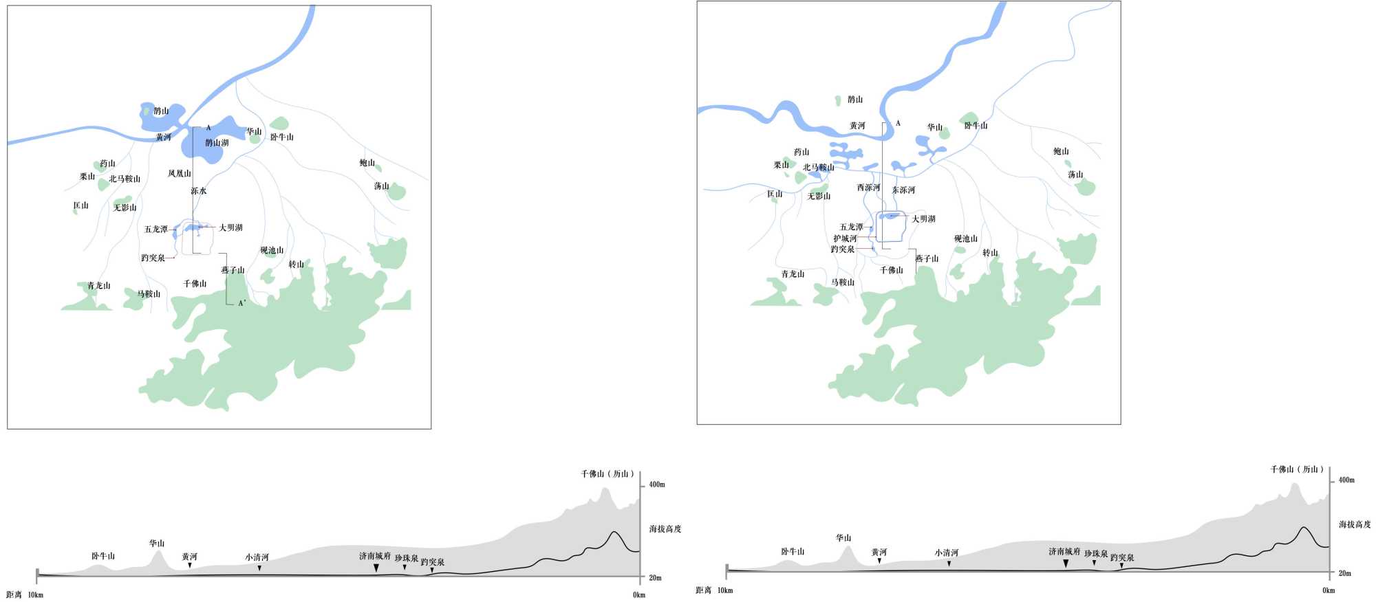 图5. 古代(左)与近代(右)济南城市平面形态及高度演变①