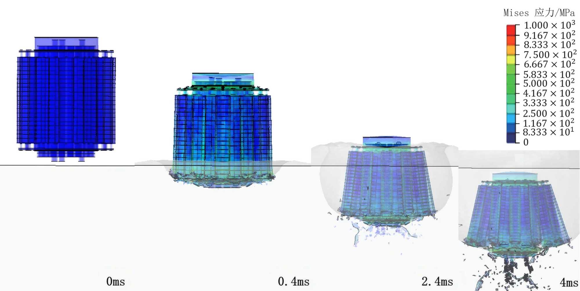 图6为90˚下空间堆撞击水体过程,0.4 ms内空间堆侧面先撞击水体,上下裙板撞击水面后弯曲变形,与筒体连接处失效;2.4 ms内空间堆完全进入水体,部分螺栓破坏失效,但仍随着空间堆向下运动;4 ms内三根安全棒中近地端安全棒从中部折断,其余两根部分破坏。