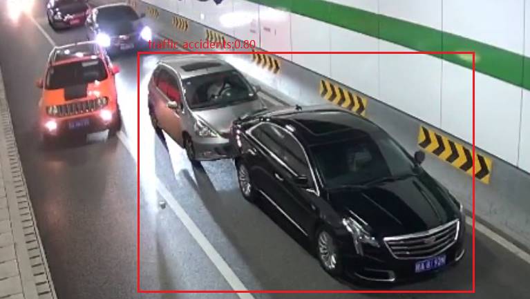 交通事故检测算法应用在实际高速公路,其算法检测出事故样本的部分示例,见图3交通事故样本,标注其名称traffic accident,交通事故相似度0.8。