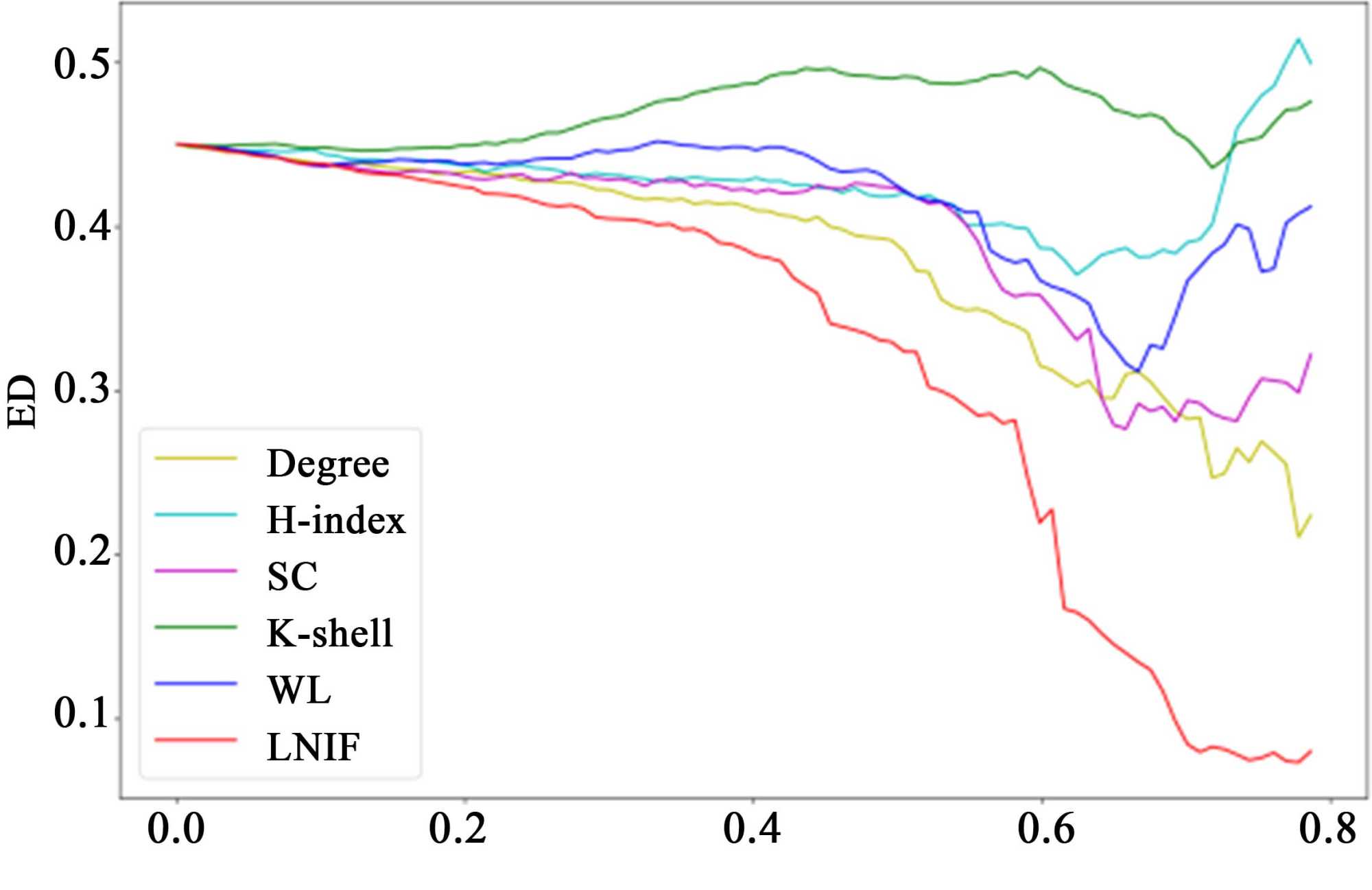 Figure 5. Changes in ED of network efficiency under different attack methods