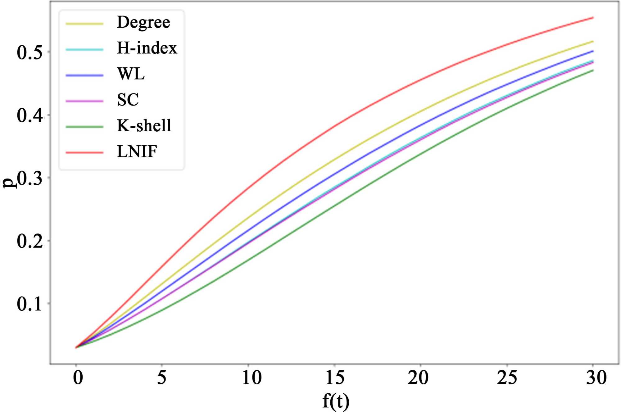 Figure 7. Changes in the proportion of network infection under different node importance algorithms (a = 0.02)