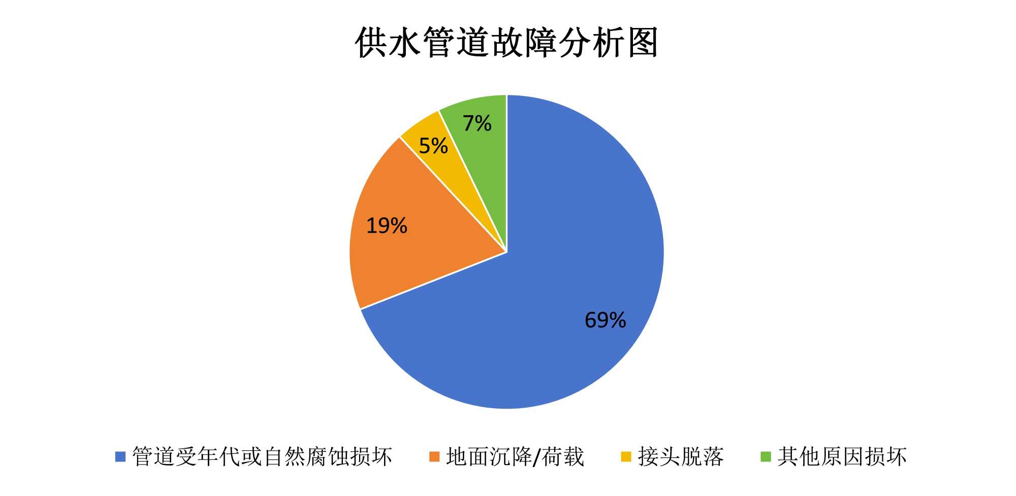 从学校后勤等相关部门获取的数据显示,某一时期内记载有42例供水管道发生故障案例,管道受年代或自然腐蚀损坏有29例,占比69%,受地面沉降或荷载影响有8例,占比19%,接头脱落有2例,占比5%,其他原因致管道损坏有3例,占比7%,见图2。