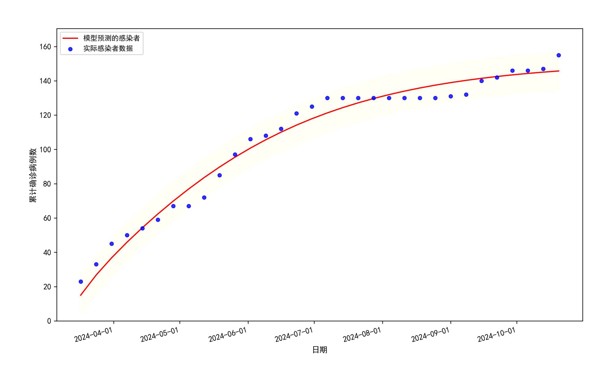 最佳的拟合结果如图4所示,将2024年3月17日~2024年9月1日数据作为训练数据用于拟合模型,如图4(a)所示,我们可以发现,该拟合值可以很好地描述疾病的传播趋势。同时将2024年9月8日~2024年10月20日数据作为测试数据,评估了模型的真实性能,如图4(b)所示。生成拟合95%置信区间。结果如图4(c)所示,我们可以看出拟合值是落在置信区间内的,进一步说明了该模型的可信度。