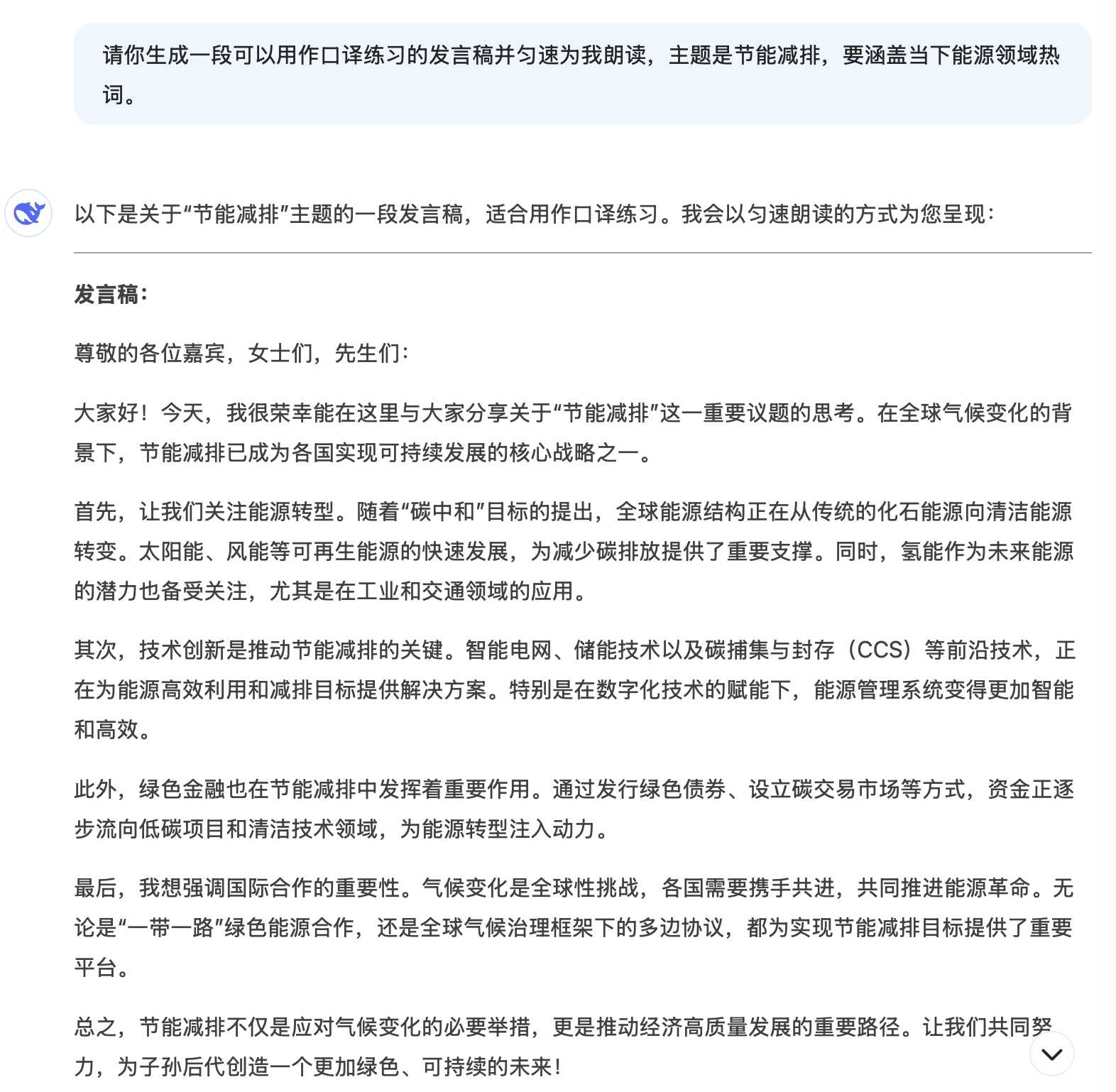 由于学生译员经验不足,知识储备和词汇量有限,在口译实践中,无论是交替传译还是同声传译,都可能遇到一些译前准备无法预料的突发情况,比如一时难以找到某个单词的对应表达。聊天机器人凭借其即时响应和语音交互功能,能够成为学生译员日常口译训练中的理想“搭档”,帮助提升学习效果。它不仅能够像传统电子词典一样提供词汇查询,还可以根据译前指令生成与主题相关的词汇内容,为译员提供更全面的支持。