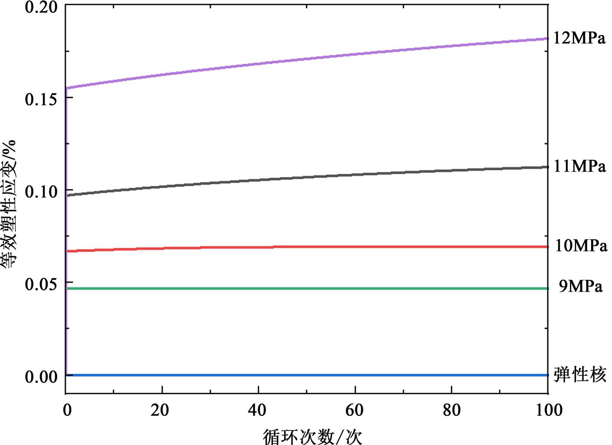 识别棘轮效应可以通过绘制节点变形–时间图,周期性行为表示非棘轮行为。等效塑性应变的历程曲线也可以用于识别棘轮效应。图6给出了不同内压作用下的等效塑性应变历程曲线,弹性核始终保持弹性,因此在全部的循环加载过程中等效塑性应变一直为0;当内压为9 MPa时,每次内压加卸载过程中等效塑性应变均不发生变化,此时结构处于安定状态;当内压为10 MPa时,在最初的循环加载过程中会发生等效塑性应变的累积,但随着循环次数的增加等效塑性应变不会随着内压的加卸载发生变化,此时结构也是处于安定状态;当内压为11 MPa或12 MPa时,在全部的循环加载过程中等效塑性应变会随着循环次数的增加逐渐累积,此时结构也是处于棘轮状态。