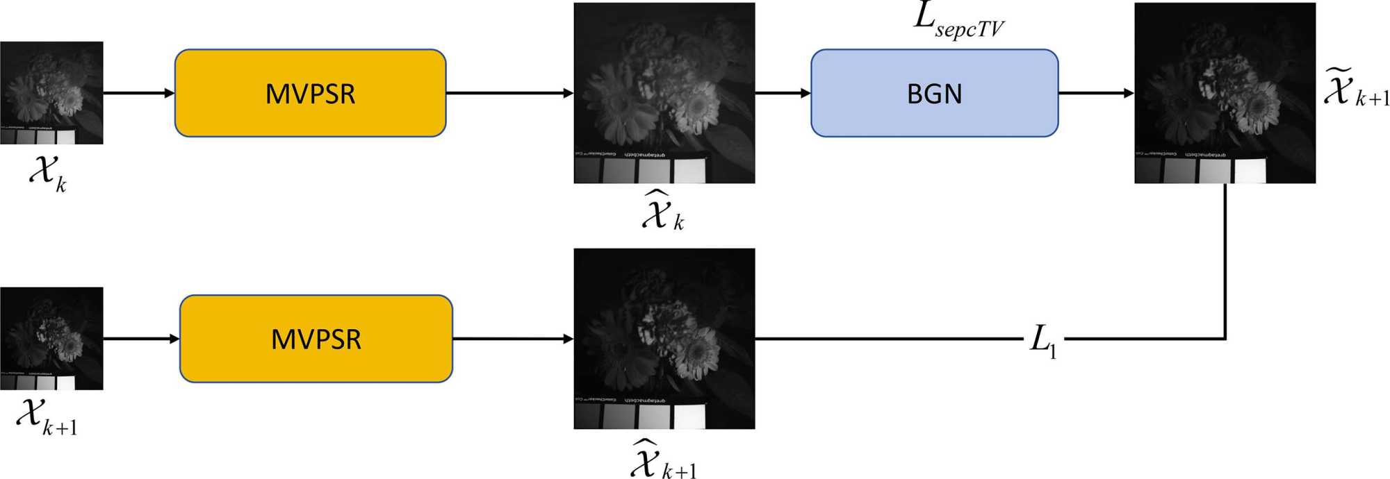 BGN在训练完成后,便可以只使用LR-HSI的第一个波段经过MVPSR网络,生成第一个波段的SR图像,后将SR图像传入BGN中得到下一个波段的SR图像,如此重复传入BGN,得到最终SR后的HSI图像。