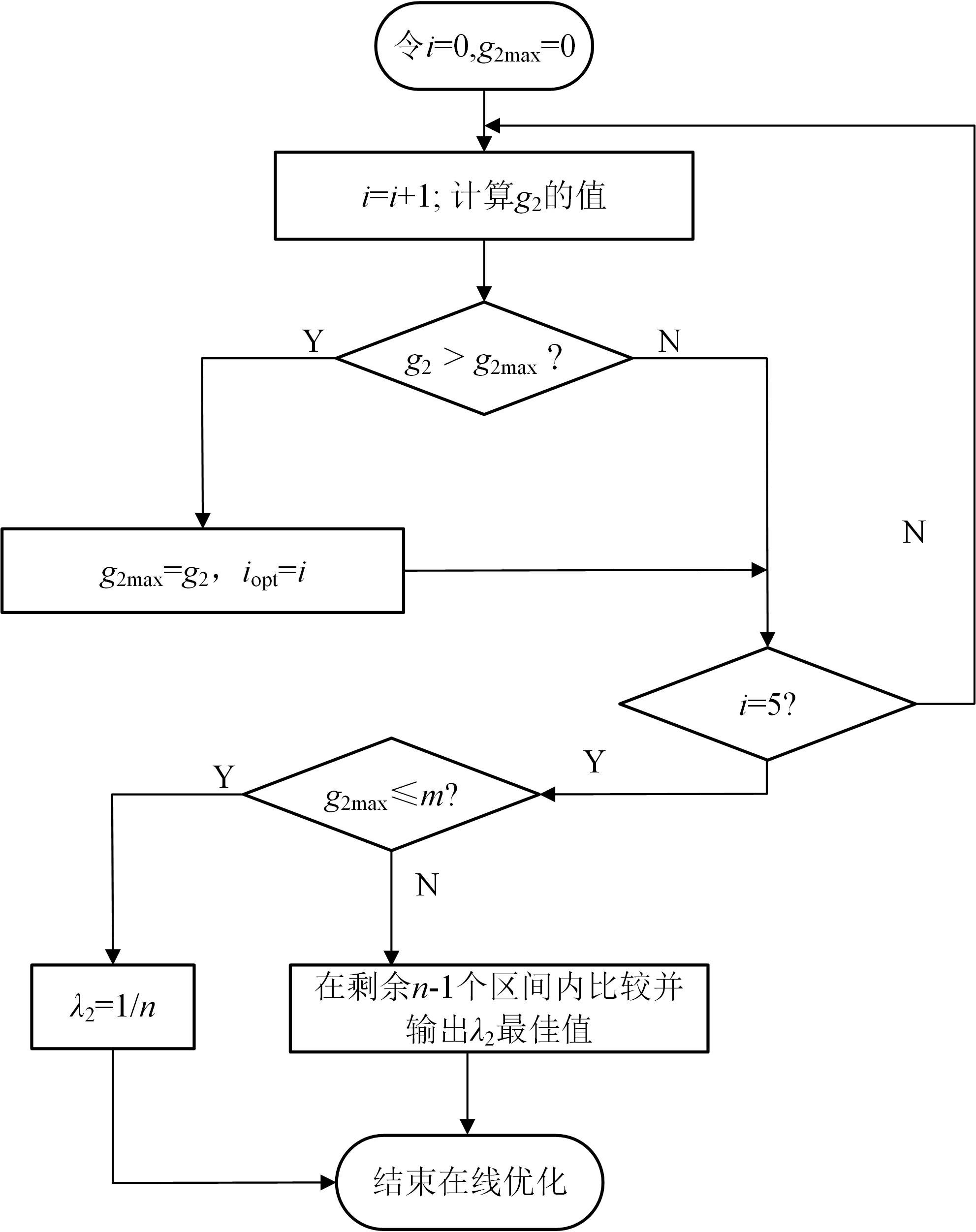 需要注意的是,在系统每个控制周期到来时,λ2值都将参与在线优化整定过程,以此在保证输出相电流为主控制目标的同时,选取出可接受误差范围内最佳的环流值。根据整个流程,在在线优化第一步过程中,收集的g2样本值的取值范围为0至1.837,同时区间数n取值为50,图2为在线优化流程图。