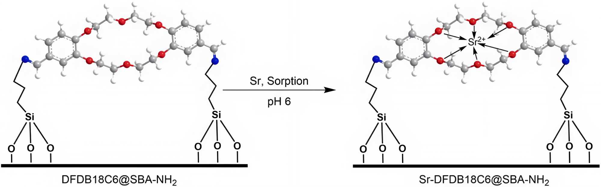 Rahmanc等人报道了一种新型固相吸附剂DFDB18C6@SBA-NH2 [14]。该材料的设计原理基于冠醚对金属离子的优异选择性和化学亲和力,如图11,通过将diformal dibenzo-18-crown-6-ether(DFDB18C6)接枝到氨基改性的介孔二氧化硅(SBA-NH2)上,形成DFDB18C6@SBA-NH2吸附剂,以提高其对Sr2+的去除能力。