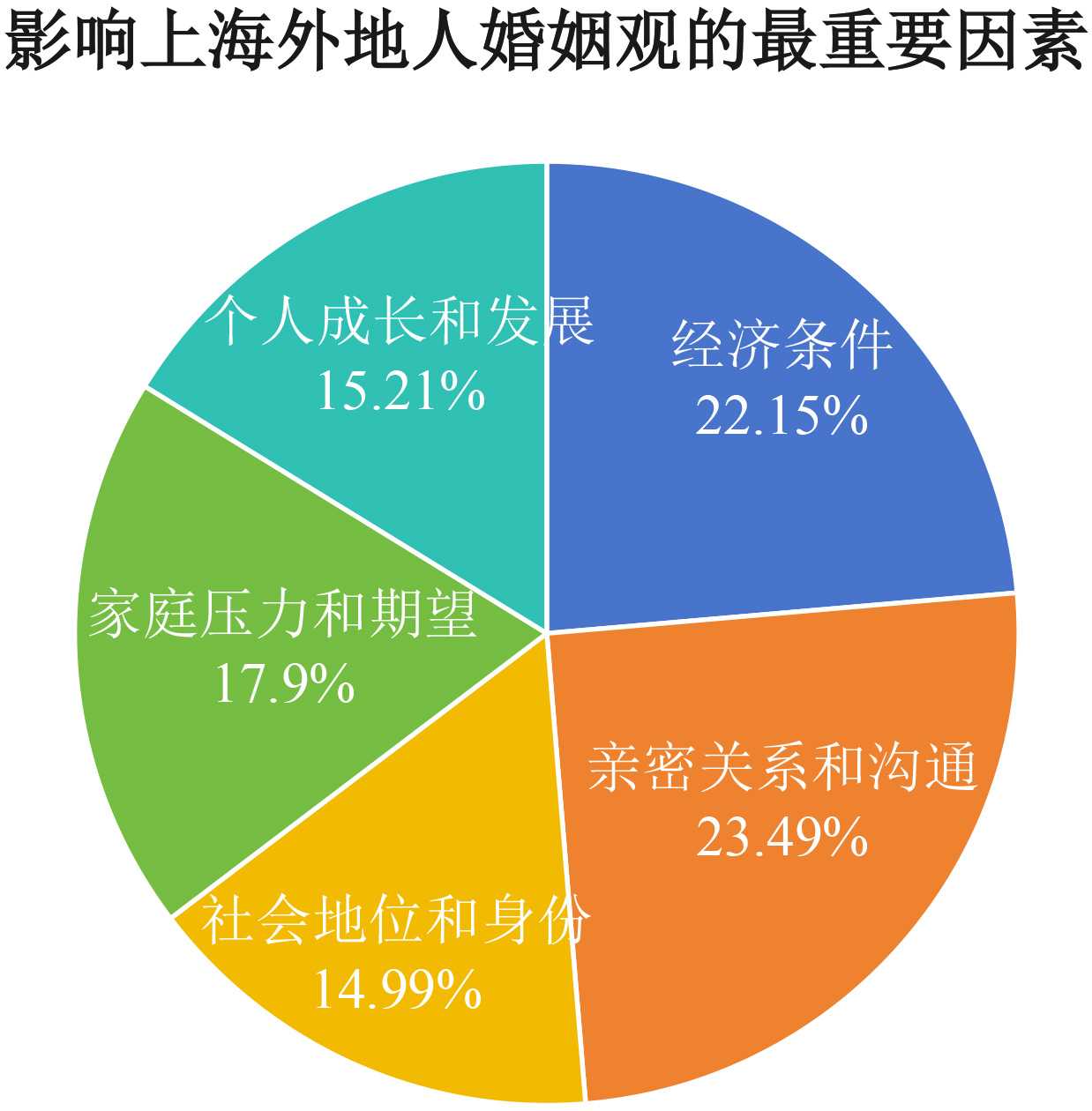 现代上海市民在选择配偶时,也受到个人价值观念的影响。人们普遍对“门当户对”这一传统观念的认可度较高,但同时也有越来越多的人重视生活方式和个人价值观念方面的匹配。调查发现(见图3),上海外地人认为婚姻中最重要的因素是亲密关系和沟通(23.49%),其高于经济条件占比(22.15%)。调查说明沟通已成为超越物质基础,成为维持婚姻幸福与稳定的重要因素。这种变化表明,尽管传统价值观仍有一定影响,但现代人们更倾向于用自己的价值观,用新的标准来定位婚姻。