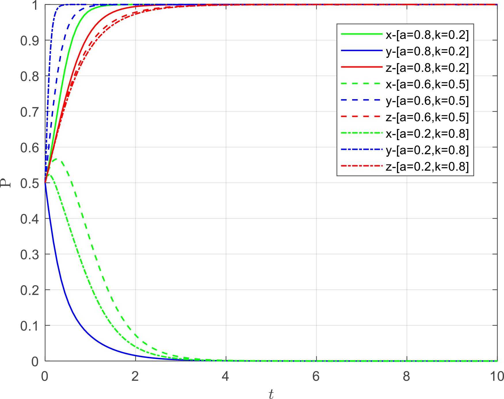 演化,当价格敏感系数降低,绿色产品投入系数升高,即a从0.8降至0.6,k从0.2升至0.4,绿色企业的策略从生产传统产品转向生产绿色产品,表明价格敏感系数的降低显著提升了绿色产品的市场需求。尽管绿色产品投入系数的增加可能对需求产生一定影响,但价格敏感系数的变化对市场需求的作用更为显著。这一策略转向揭示了价格敏感系数在均衡选择中的主导作用,说明绿色企业在权衡投入与市场需求后,倾向于选择生产绿色产品以实现更优的均衡状态。