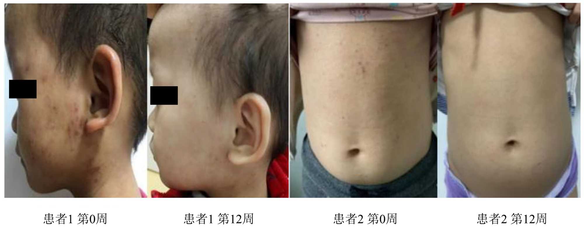 比较全部患儿在Dupilumab治疗前、治疗后第12周的不同部位的皮损照片,可以发现患者在治疗后红色斑块、丘疹皮损逐渐消退、变平,治疗12周后皮损显示几乎完全消除,留有色素沉着,以2例患者为例,见图2。