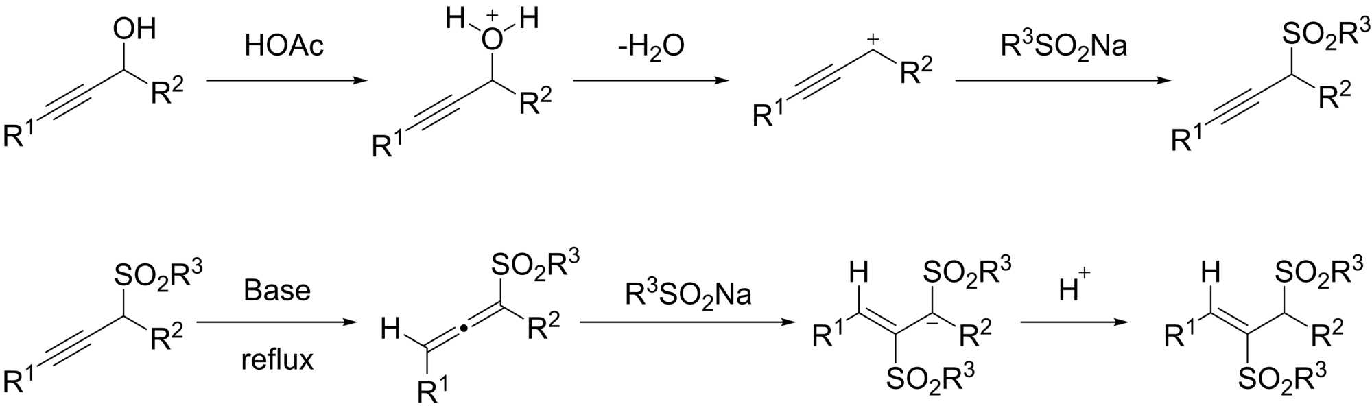 2022年,谢美华课题组报道了一种简单条件下使用炔丙醇与亚磺酸钠作为反应物,通过调节反应温度,可以选择性地合成双磺酰化产物((E)-烯丙基、乙烯基二砜)或单磺酰化产物(炔丙基砜) [9] (图6)。使用醋酸和水的混合溶剂(1:1),在回流温度下可以得到高产率的双磺酰化产物,而在32℃下反应则主要得到单磺酰化产物。反应过程中炔丙醇的羟基被质子化,随后脱水生成炔丙基阳离子中间体,该中间体与亚磺酸钠反应生成单磺酰化产物;在回流温度下,单磺酰化产物的炔丙基氢被碱夺取生成联烯砜中间体,再次与亚磺酸钠反应生成双磺酰化产物。