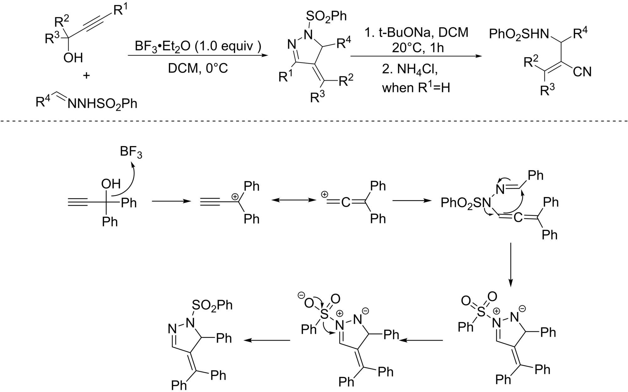 2011年,Lu小组报道了路易斯酸三氟化硼乙醚促进炔丙醇和N-磺酰基腙反应生成并进一步将其转化为3,3-二芳基丙烯腈[16] (图13)。在该反应体系中,N-磺酰基腙进攻由三氟化硼乙醚催化炔丙醇生成的联烯碳正离子中间体得到N-磺酰基联烯胺中间体,之后中间体发生分子内亲核进攻得到二氢吡唑类产物。所获得的产物在叔丁酸钠催化,二氯甲烷作为溶剂在室温中可以进一步以大于86%的收率得到3,3-二芳基丙烯腈衍生物。其在天然产品、药物和染料的有机合成中具有广泛的用途。