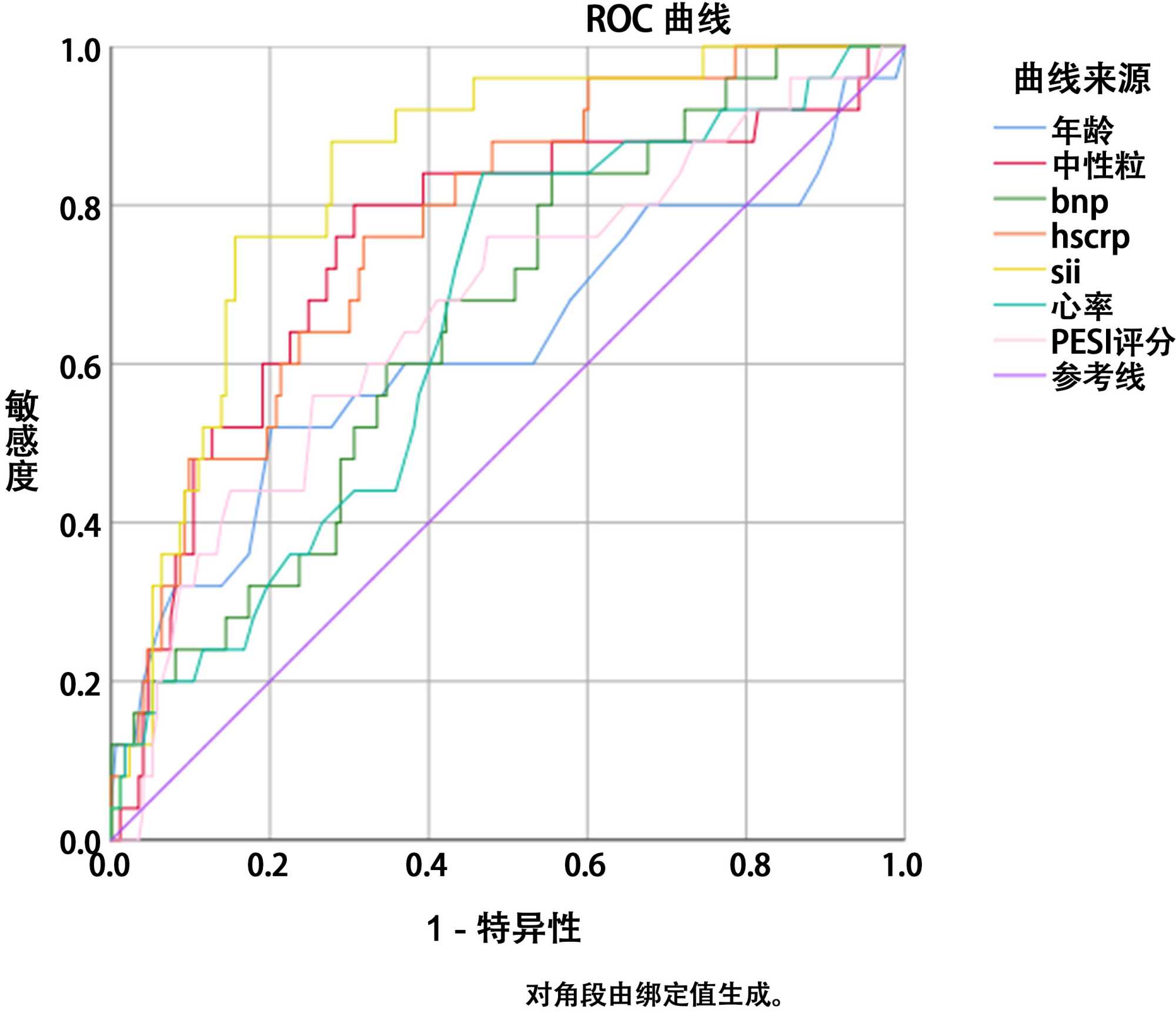 图1. hs-CRP、SII、心率预测APE肺栓塞相关死亡的ROC曲线