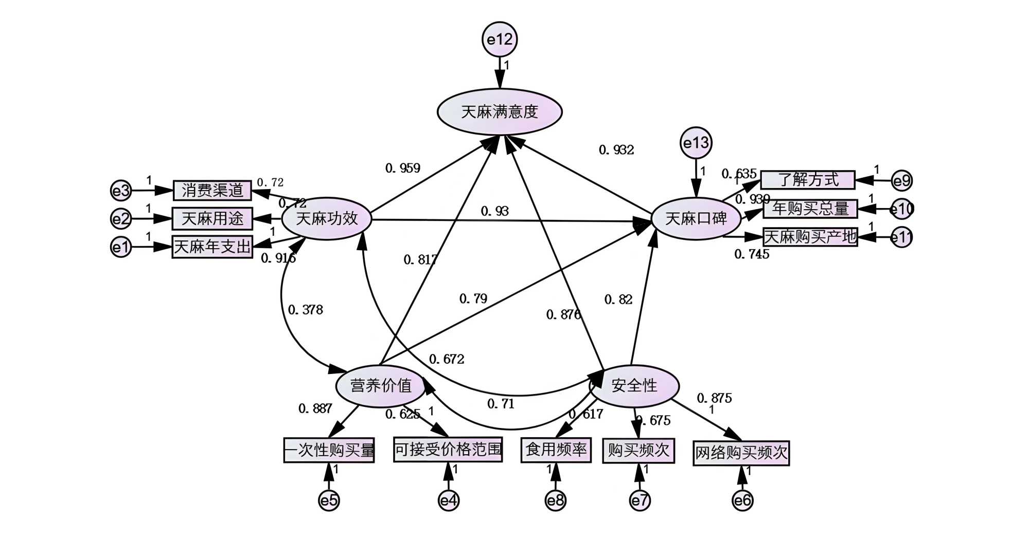 在0.05显著性水平下对消费者对天麻的满意度产生正影响,且天麻口碑可以由食用频率,购买频次和网络购买频次来测量,同时网络购买频次量对天麻安全性影响关系最为显著,影响系数为0.875,故收集消费者的网络购买次数数据对天麻安全性的研究更加重要。