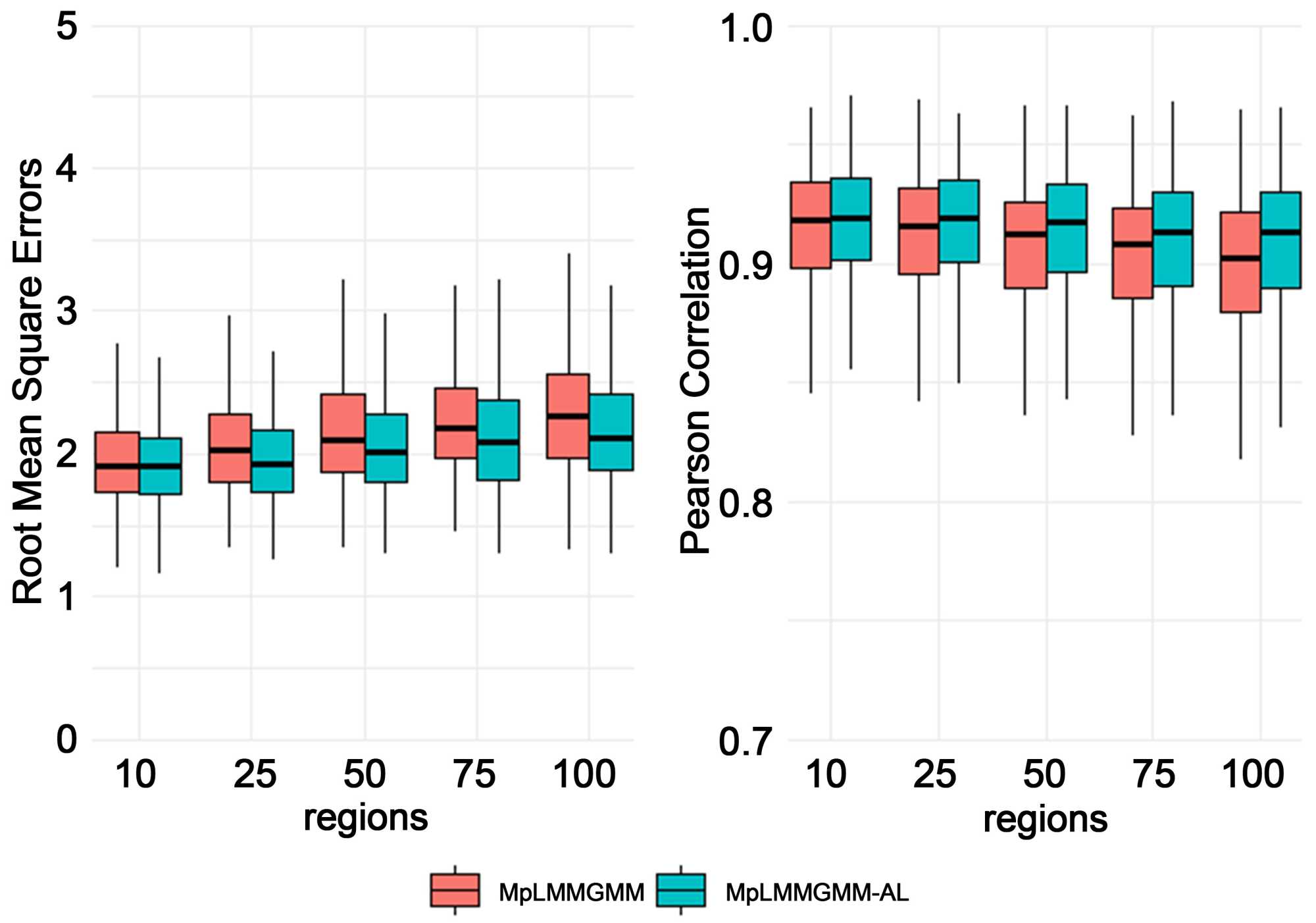 我们将SNV和CpG位点定位到基因区域,并基于因果基因模拟定量表型,其中25%的SNV位于被指定为因果基因的因果基因上。对于下面描述的所有模拟,我们将前三个区域设置为关联区域,而将其余区域设置为噪声。我们假设样本量为500,其中70%的样本用于模型训练其余用于模型评估。预测精度采用Pearson相关性和均方根误差(RMSE)来衡量。对于我们提出的方法,我们还计算了从不同疾病模型中正确选择预测区域的概率。