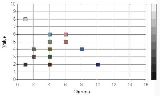 该案例中KS 5B 8/1 (Bright grayish blue)的比例最高,为16.57%,其次是KS 5YR 5/6 (brown),占比为15.75%;KS 2.5Y 6/4 (Earthy yellow)的占比为11.54%;KS 5YR 2/4 (Dark brown)占比为3.36%。 |