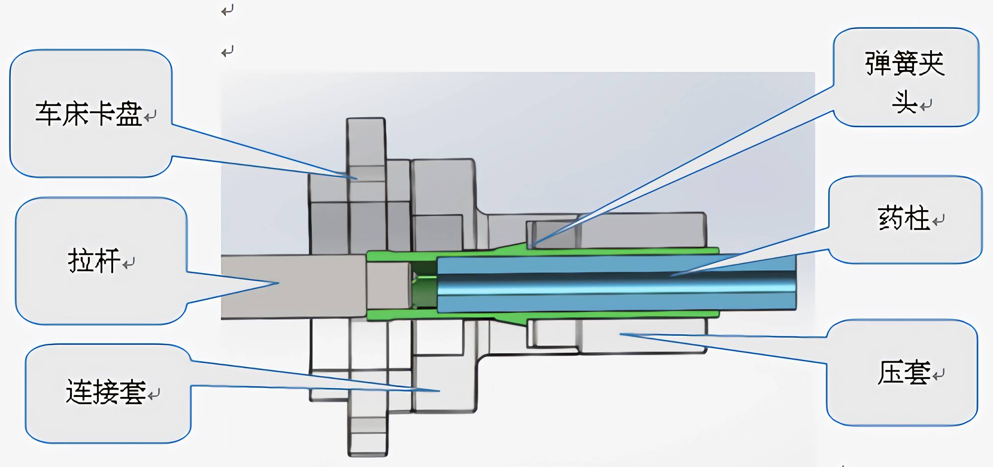 内孔加工若要实现自动加工,其加工过程应为:弹簧夹头装夹药柱后,尾座中装夹有钻头,通过尾座前后移动实现钻头在药柱内孔中的进给,实现药柱的自动加工。