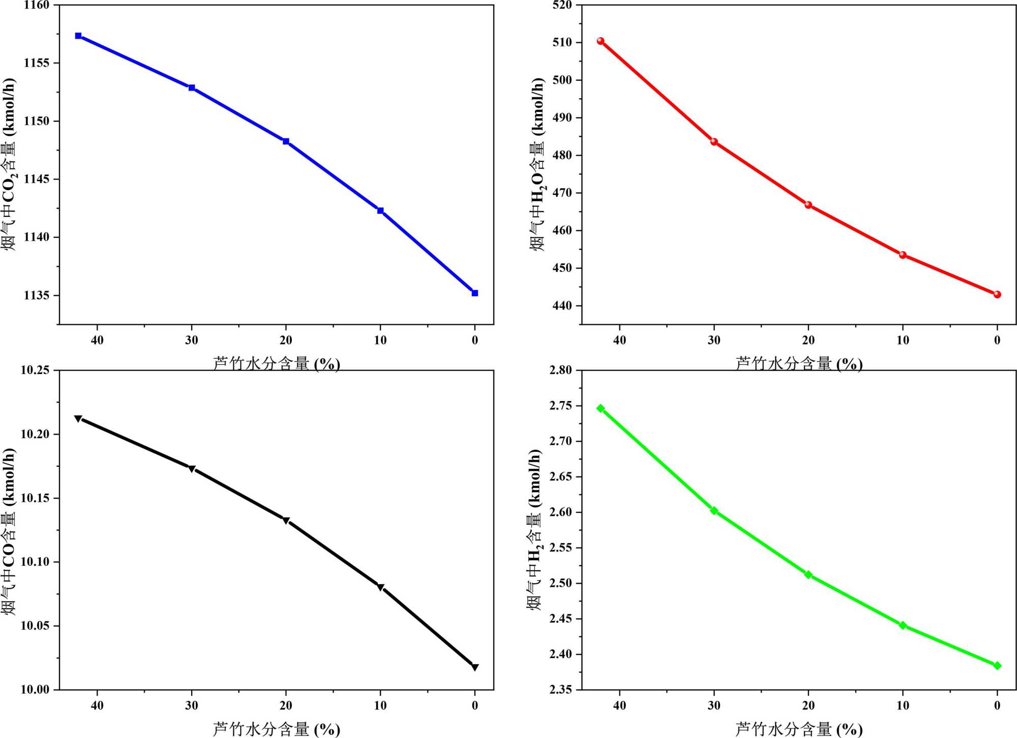 图3. 芦竹水分含量对燃料反应器出口烟气各组分含量的影响(芦竹掺杂比为10%)