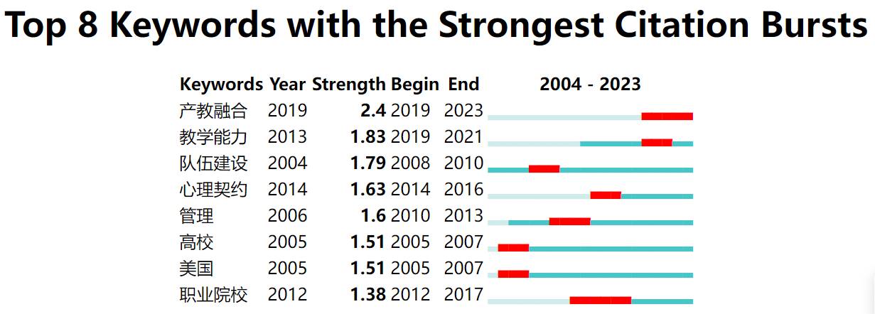 为了分析兼职教师研究议题在期刊论文中的关键词演变过程及其随时间的起始和变化情况,其中特别关注那些标志显著转折点的时间段,在视觉展示上通常会标记为红色,以此突出其突发性和重要性。通过CiteSpace对关键词进行分析得到关键词突发强度前8名概况(图5)。
