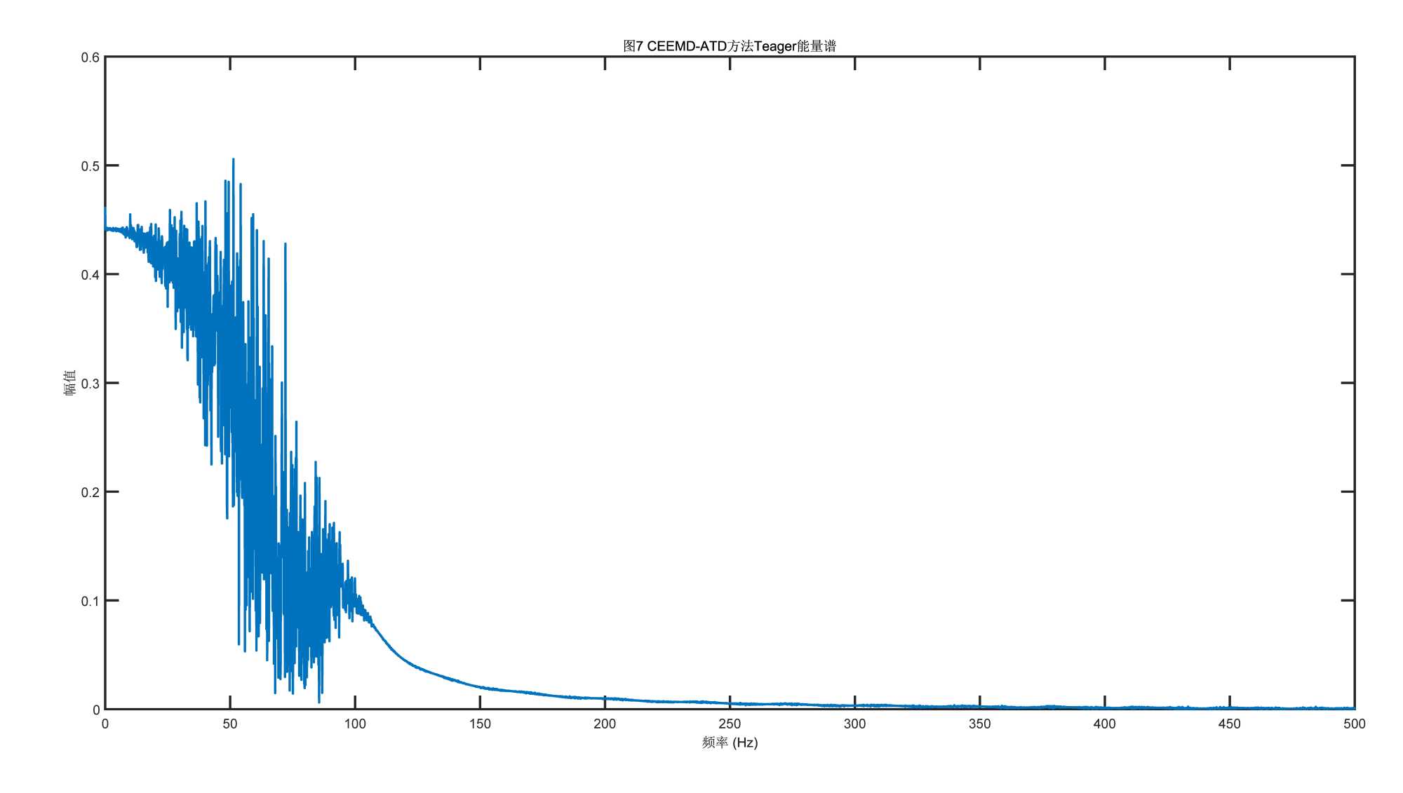 从图中可以看出,图3~5分别展示了C-A方法、CA-W方法和CA-A方法的Teager能量谱。首先,观察图3的C-A方法,其能量谱在低频段(10~100 Hz)较为密集,表明该频段内的频率成分较多,能量较高。随着频率的增加,能量逐渐减小,谱密度变得平滑。其次,图4的CA-W方法显示,在低频段同样有较高的能量集中,但相比图3,其低频段的能量幅值较低,表明该方法在低频段的效果不及C-A方法。最后,图5的CA-A方法在低频段能量最大,与前者波形较为相似,仅幅值的最大值偏高。但在高频段,3张图的趋势幅值都趋于降低,最终平稳趋近于0。总结来看,CA-A方法(图5)在频率成分上的幅值最高,而C-A方法(图3)在低频段能量较为集中。这些差异可能源于不同方法在信号处理过程中对噪声和频率成分的敏感程度不同。