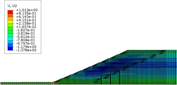 这是由于多个方面的因素共同造成的。首先是材料属性的变化,在地面线以下材料由机场道基的填土过渡到地基土层,相应的模量增大,其抵抗变形的能力也增强;其次是地基在计算之前已经进行过了地应力平衡,其每个计算单元中的应力分布是均匀的,在土基自重应力作用下的沉降已经发生了,可以理解为每个单元体是不受其自身重力的影响的。因此到了地面线以下土体所承受的附加应力是恒定的,而力的传递随着深度的加大必然会逐渐减弱,因此沉降量也相应减小;最后是在模型的底部是存在竖向固定的约束条件的,这种约束也是完全合理的。因此,在多方面的影响下,整个模型的总沉降分布就呈现出先增后减的趋势。