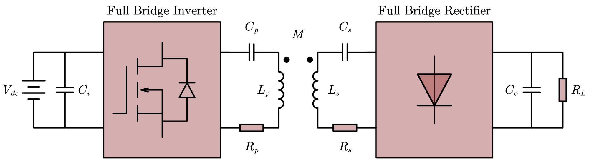 该系统总体采用对称式架构设计,包含原边与副边两个能量传输单元,通过松耦合变压器与补偿网络实现磁耦合谐振,从而传输功率。原边通过全桥逆变器将直流电源转换为高频交流信号,经谐振耦合传输至副边,副边通过同步整流全桥实现交流–直流转换,最终经滤波电路为负载提供稳定直流电压。原边全桥逆变器实现逆变功能,而副边全桥整流器结构将交流电整流为直流电,经过输出滤波电容之后为负载供能。