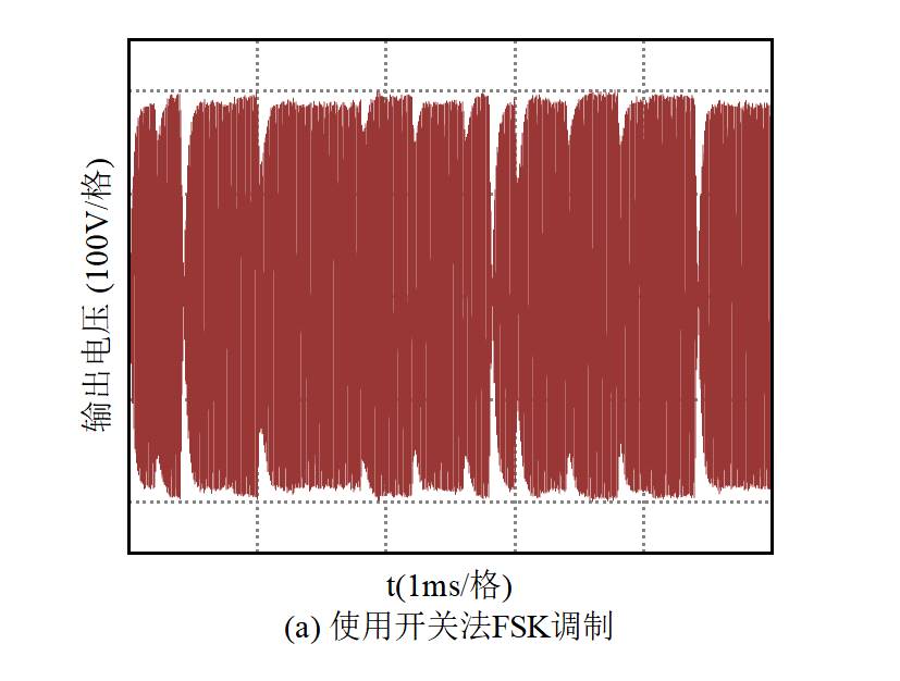 如图9所示为系统在补偿网络之后的电压输出波形,其中图9(a)为使用开关法进行FSK调制来传输信息时的输出波形,图9(b)为使用MSK调制来传输信息时的输出波形。对比两图可知,通过MSK调制来代替FSK调制可有效降低输出电压的波动,提高电能传输的质量。使用MSK调制时,输出电压峰值在约200 V与约170 V之间跳动,电压波动在15%左右,满足2.2.小节中的需求。