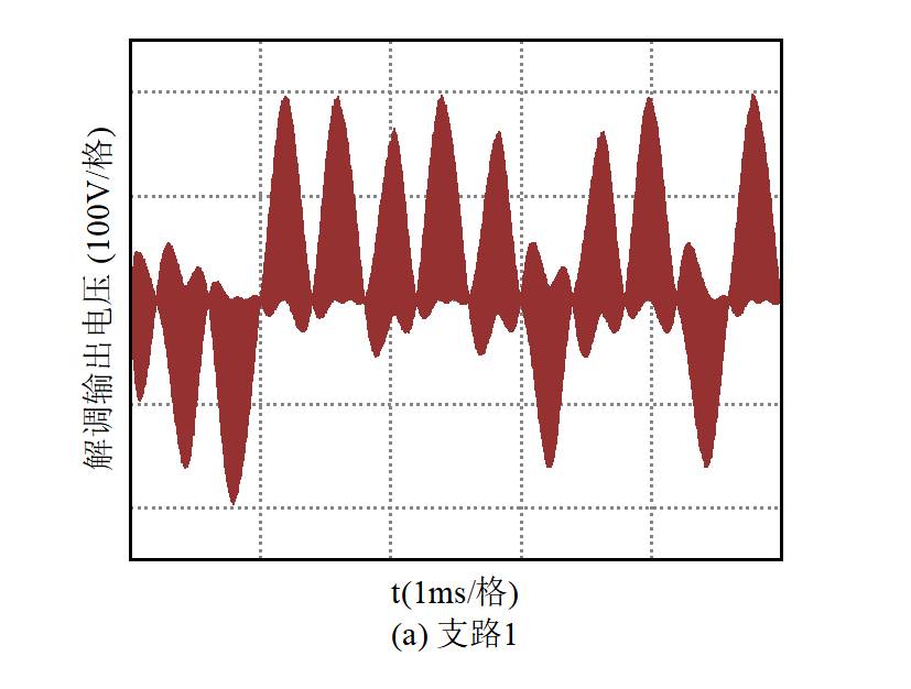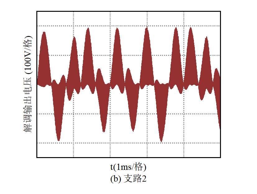 对输出电压进行解调,将其分别与两个恢复的载波相乘后可得如图10所示的波形,可见波形的高低变化十分明显,通过低通滤波之后即可进行抽样判决,再将两路信号进行并串转换之后即可得到所需传递的信息。根据图10所示波形,并串转换前每路信号的码元宽度为0.4 ms,对应并串转换后的码元宽度为0.2 ms,即所实现的信息传输速率为5 kbit/s,与理论分析相符。