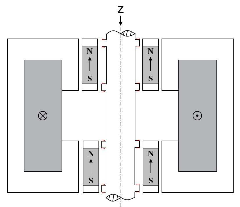 ,其中Z0为两个气隙的平均值,Z为电枢相对于中间位置的轴向位移。这两个间隙会随着电枢在轴向上的运动而变化,但它们的总和保持不变。虚线表示永磁体的偏置磁通路径,它会从径向进入电枢,从顶部和底部表面退出电枢,接着通过C形定子铁芯,最终返回磁铁。实线表示励磁线圈产生的磁通路径。如果两个绕组槽内的实际电流与图2所示的参考电流方向一致,则偏置磁通和激励磁通在电枢底面相加,在电枢顶面相减。从而电枢底部表面的法向力将大于电枢顶部表面的法向力,产生+Z方向的净力。而当实际电流方向与图2所示方向相反时,轴向电磁力的方向也会随之发生变化。