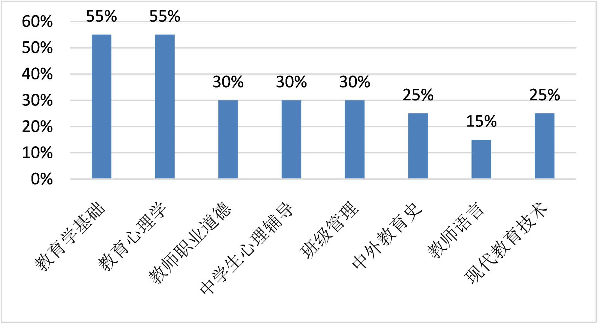由图1,图2,对于数学专业课,60%的学生学习过数学分析、高等代数、概率论与数理统计、空间解析几何等专业课,45%的学生学习过实变函数论、复变函数论、常微分方程等专业课,30%的非数学专业学生学习过微积分、线性代数等课程。对于教育类专业课,55%的学生学习过教育学基础、教育心理学等课程,30%的学生学习过教师职业道德、中学生心理辅导等课程。通过调查发现: