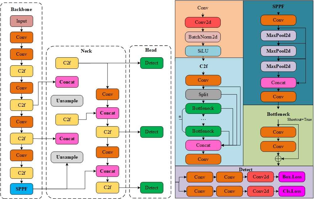 (2) 骨干网络结构。YOLOv8的骨干网络结构继承并发展了YOLOv5的核心思想,通过层级化特征提取实现多尺度信息捕获。基础结构采用步长为2的3 × 3卷积进行下采样,配合特征强化模块构建深层语义表征。与YOLOv5的C3模块相比,YOLOv8创新性地引入C2f模块,通过增加并行分支数量形成更丰富的梯度传播路径,使特征学习过程具备更强的多流形表达能力,模块深度参数依据模型规模动态调整(基础配置为3/6/9/3)。
