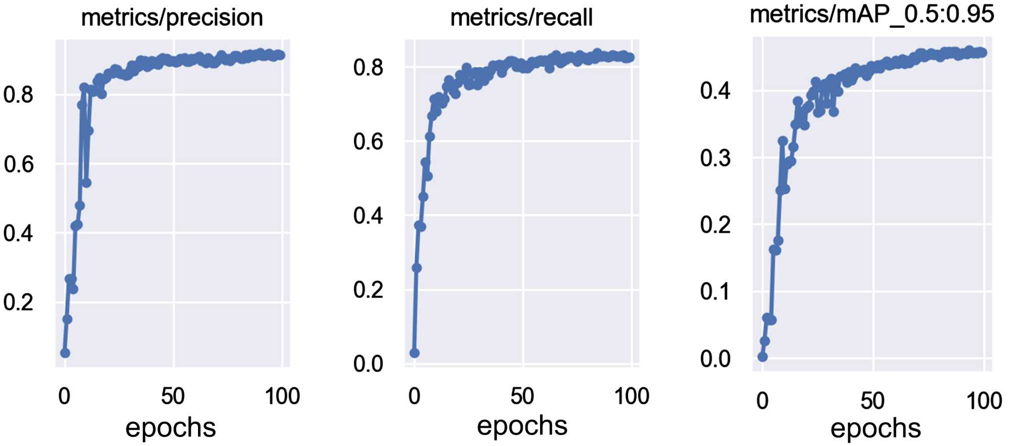 由于Soft NMS算法无需额外的训练,只需在推理和验证阶段将传统NMS替换为Soft NMS,即可实现优化,而不会增加额外的参数量和计算量。因此,本节仅使用Precision、Recall和mAP来对模型性能进行分析,训练结果图如图4所示。
