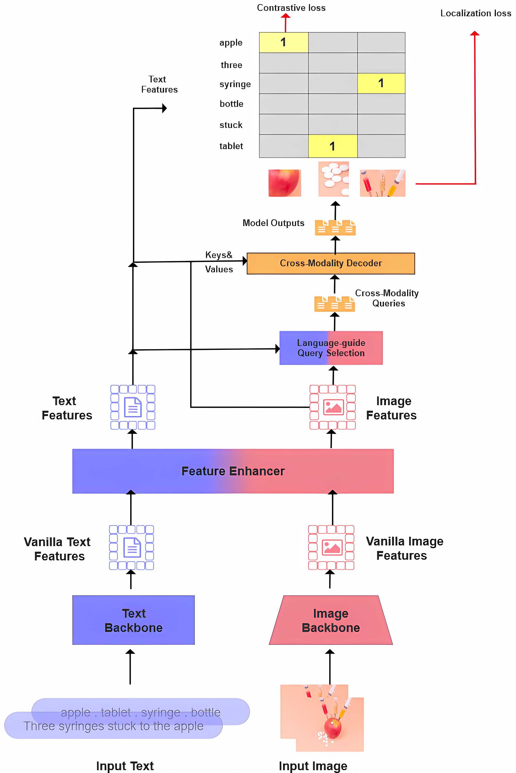 输入与特征提取:输入层由图像输入和文本输入组成。其中图像输入是通过Swin Transformer等[11]视觉主干网络提取多尺度图像特征(Vanilla Image Features)。而文本输入是通过BERT等语言主干网络提取文本特征(Vanilla Text Features),支持短语、句子或子句级别的语义表示。