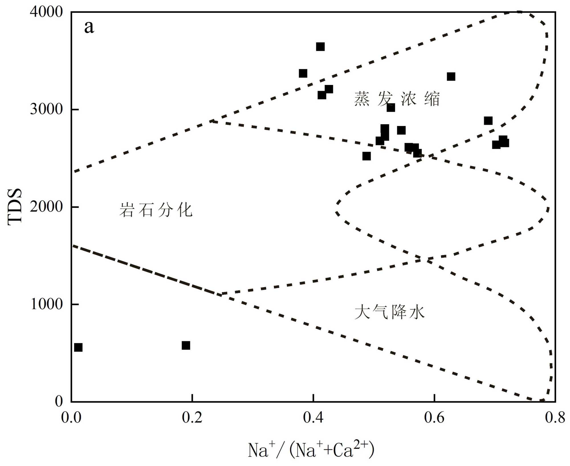 Gibbs图可以确定控制水化学的主要机制,用于研究水化学组成与气候或地质特性之间的关系。Gibbs在建立TDS与Na+/(Na+ + Ca2+)和Cl−/(Cl− +